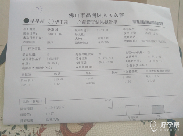 你好,临界风险是需要进一步做无创或者羊水穿刺确诊