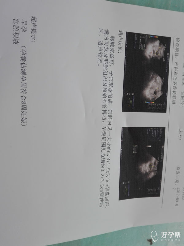 B超提示有胎芽胎心,注意多休息,继续保胎治疗。,