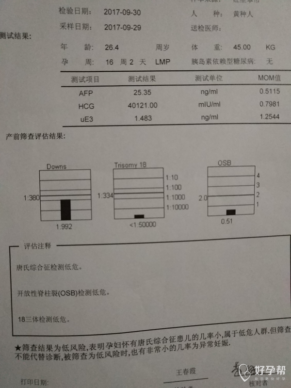 今天拿了唐氏筛查结果,麻烦医生帮忙看看。
