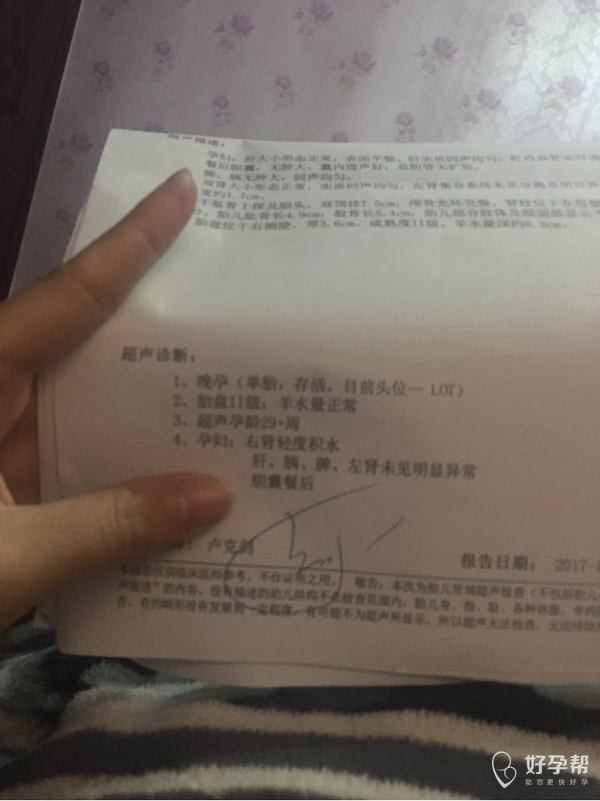 你好,胎儿双顶径7.5,大约近7个半月左右,与你孕29周多基本相符,定期孕检