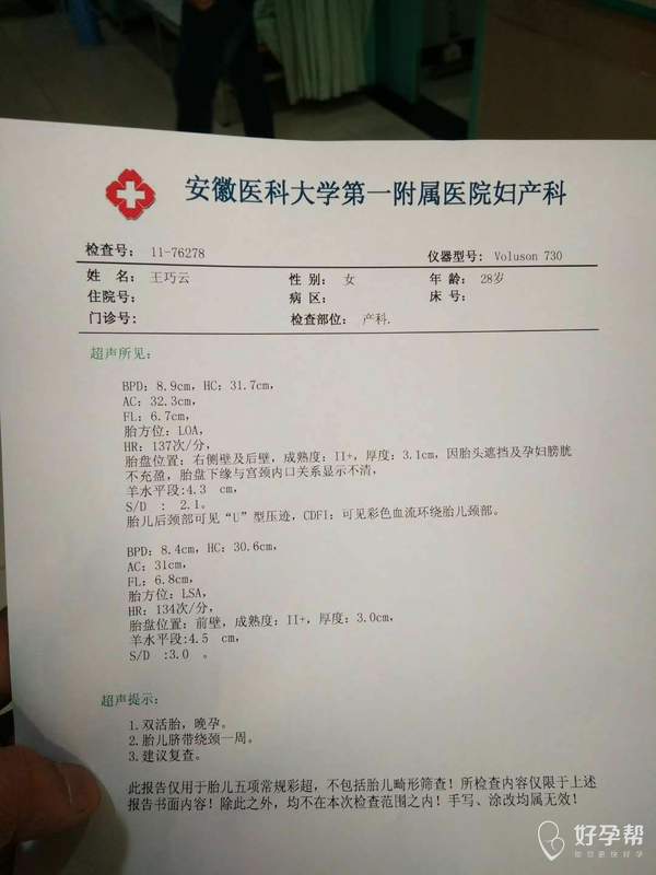您好,胎儿一个5斤半左右,一个4斤半左右,脐带绕颈一周,按时产检,注意胎动,祝您好孕。