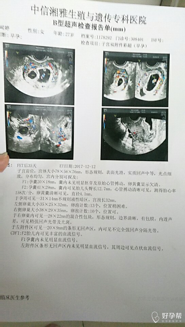 你好!根据彩超检查结果,一个孕囊停止发育了,是可以吸收的,对另一个没有多大影响,不必处理,定期产检,服用叶酸到...