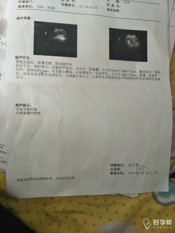 你好,胎儿发育正常,右侧卵巢囊肿,先观察一下,如有腹痛流血及时就医。按时产检。