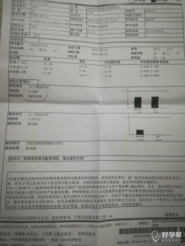 是临界风险,建议做无创DNA或者羊水穿刺。
