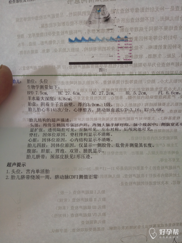您好,根据彩超看,目前怀孕30周左右,胎儿发育正常,羊水正常,胎盘位置正常,有脐带绕颈一周,一般没事的,密切观察胎动,定期产检,祝您好孕,记得点击采纳!