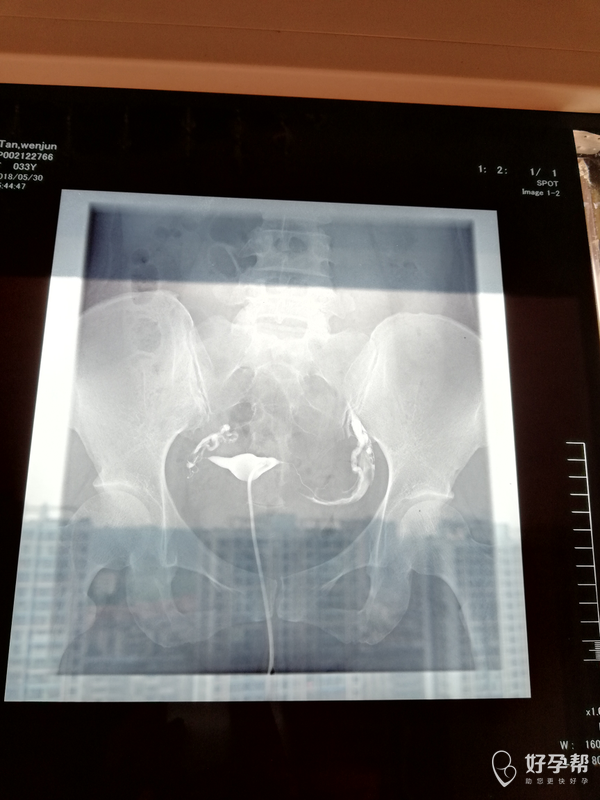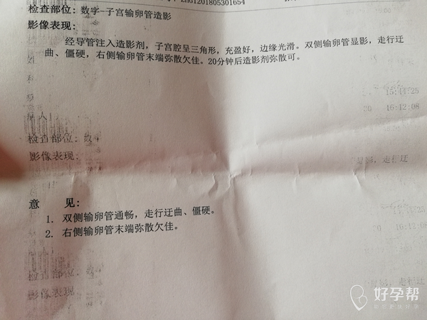 输卵管造影,双侧走行迂曲、僵硬,右侧末端弥散欠佳。