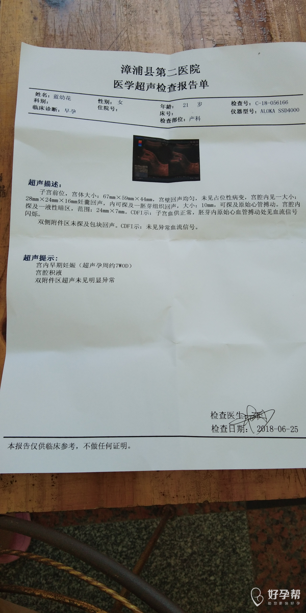 您好,现在怀孕7周,目前胚胎发育良好。孕囊周围有少许积液,考虑是少量出血,需要按先兆流产休息保胎治疗,可以口服...