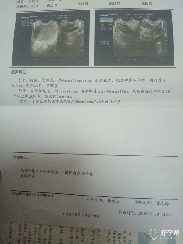 多囊,双侧十个以上的小卵泡,输卵管一边上举粘连一边堵塞,