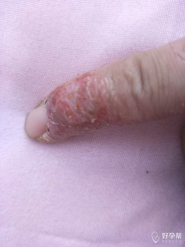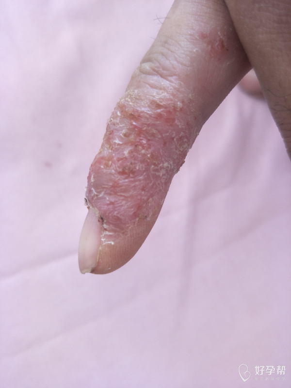 可能是湿疹,建议去医院检查后再用药治疗,尽量少沾水,不要接触肥皂,洗衣液等化学品,平时不要吃辛辣刺激性食品及寒...