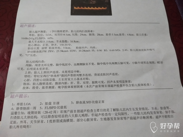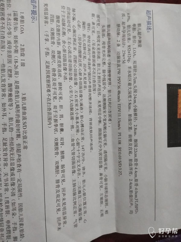 您好宝妈,检查结果都在正常范围之内,B超检查方位不同测量结果都是有误差的,放心吧。加强后期营养饮食以清淡为主多吃豆制品高蛋白的食物,不能吃辛辣油腻刺激性的食物,有利于胎儿的生长发育,补充维生素D及钙剂,白天服维生素D多晒太阳有利于钙的吸收,晚上服钙剂,从现在开始要每两周监测一次胎动到孕36周改为每周监测一次,休息时采取侧卧位,以左侧卧位为主,利于胎儿的生长发育,不能平卧,定期产检,放平心态,祝好孕!觉着我的回复对您有帮助,请点采纳,谢谢你了!