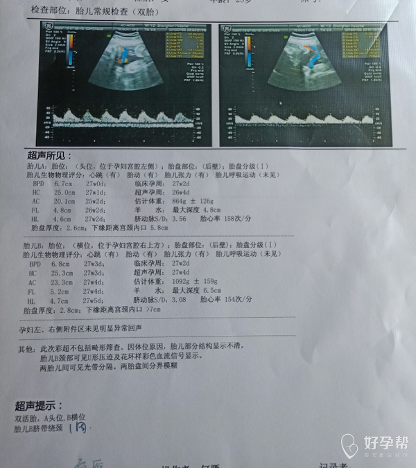 你好,宝妈。1 正常27周胎儿:胎长34厘米左右,胎重900克左右,双顶径(BPD)的平均值为6.98士0.57厘米,腹围(AC)的平均值为21.81士2.12厘米,股骨长(FL)为5.10士0.41厘米.孕28周的胎宝宝,胎长约为35厘米,胎重约为1150克,双顶径的平均值为7.24士0.65厘米,腹围的平均值为22.86士2.41厘米,股骨长为5.35士0.55厘米。与B超数据相对,两个宝贝B宝贝在正常范围,A宝贝的腹围稍微偏小一点。2 本身孕双胎宝宝发育就不是一致的,临床中大多一个“重”一个“轻”,但两个宝贝总体发育在正常范围,对于阿司品林,临床中认为每日低剂量阿司匹林(每天60至150mg),对降低高危妇女,子痫前期、早产和宫内发育迟缓风险有明显的效果。如果是此范围可以适当服用,之后一定动态观察胎儿发育情况哦。如果不放心直接上级医院就医检查看看再定论。3 定期产检,祝你好孕。如果我建议对您有帮助,请记得选择点击采纳