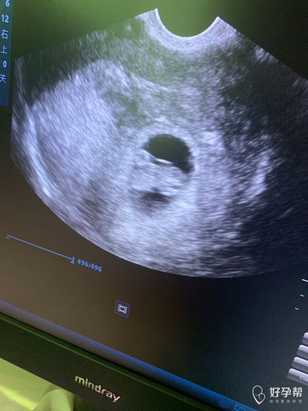 这张图片没有看到明显宫腔积液和盆腔积液,看到了卵黄囊和一小胚芽,胎心要动态看,图片不是太清楚看起来难一些,恭喜宫内怀孕了,有7周左右?