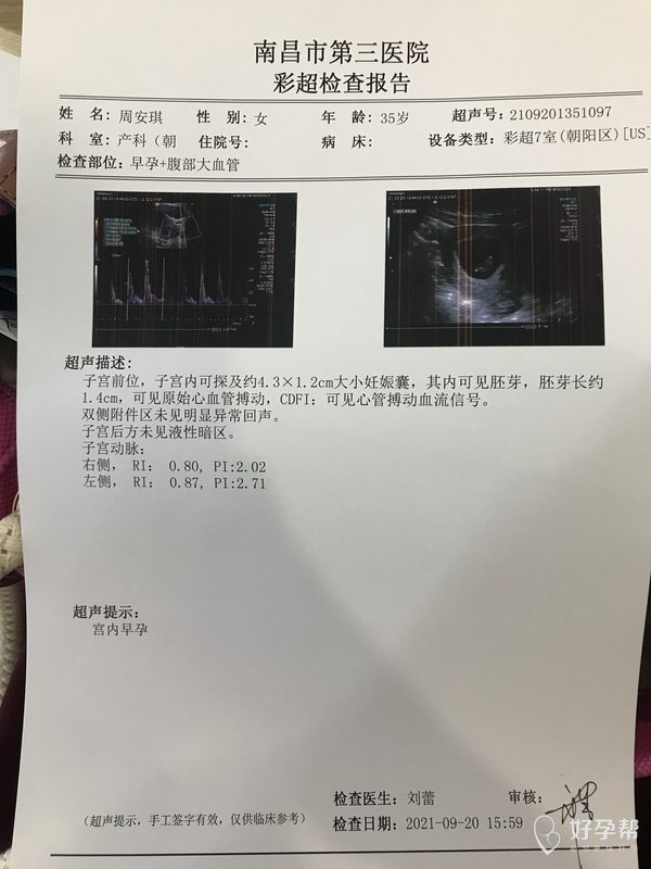 有胎心胎芽 孕囊大小和孕周相符 血流指数正常的