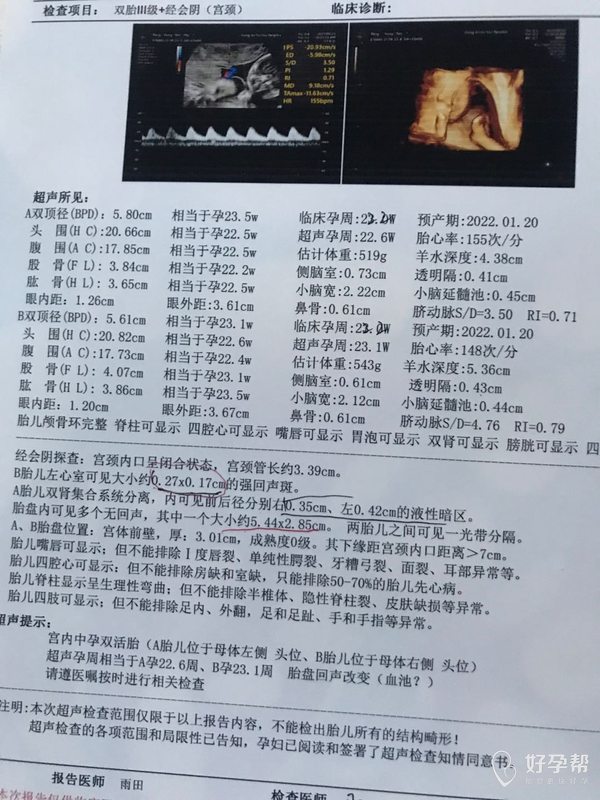 恭喜你家两宝长的挺好的,超声孕周和月经孕周相符,胎儿心室强光点只有一枚可以观察,应该做了无创DNA吧,无创低风险就没问题,可以预约一个28—32周小排畸或胎儿心脏彩超,胎盘位置正常,血池先观察肾盂分离值没有超标准,宫颈长度正常,后期注意宫颈长度防早产,适当休息,补充铁剂和钙,祝顺孕!