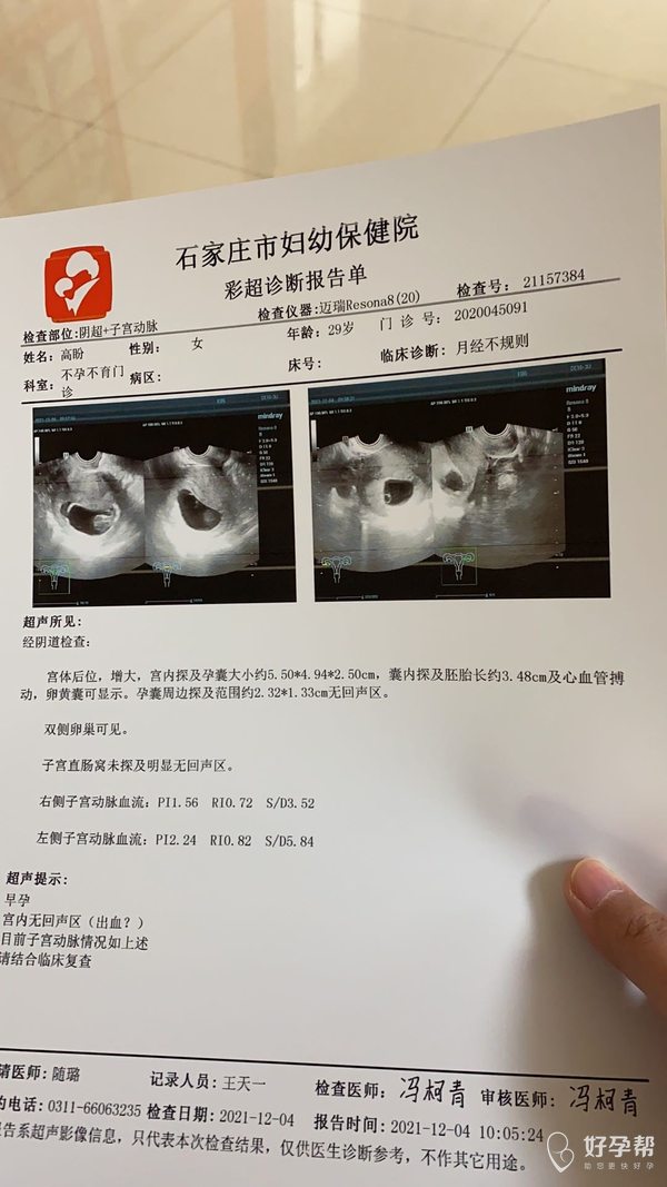 根据B超的胎芽,大约是10周+2,孕囊旁有出血,建议保胎,滋肾育胎丸和地屈孕酮。11+5周,可以查Nt的,Nt的时间是11-13+6周期间都可以的。不能剧烈活动。