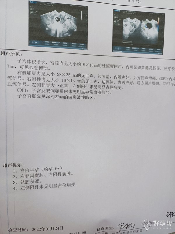 彩超检查结果提示胚胎发育正常 有胎心胎芽 如孕50天左右 右侧卵巢囊肿无回声 直径小于5cm可以观察 孕期产检彩超检查就可以 定时产检 定时口服叶酸