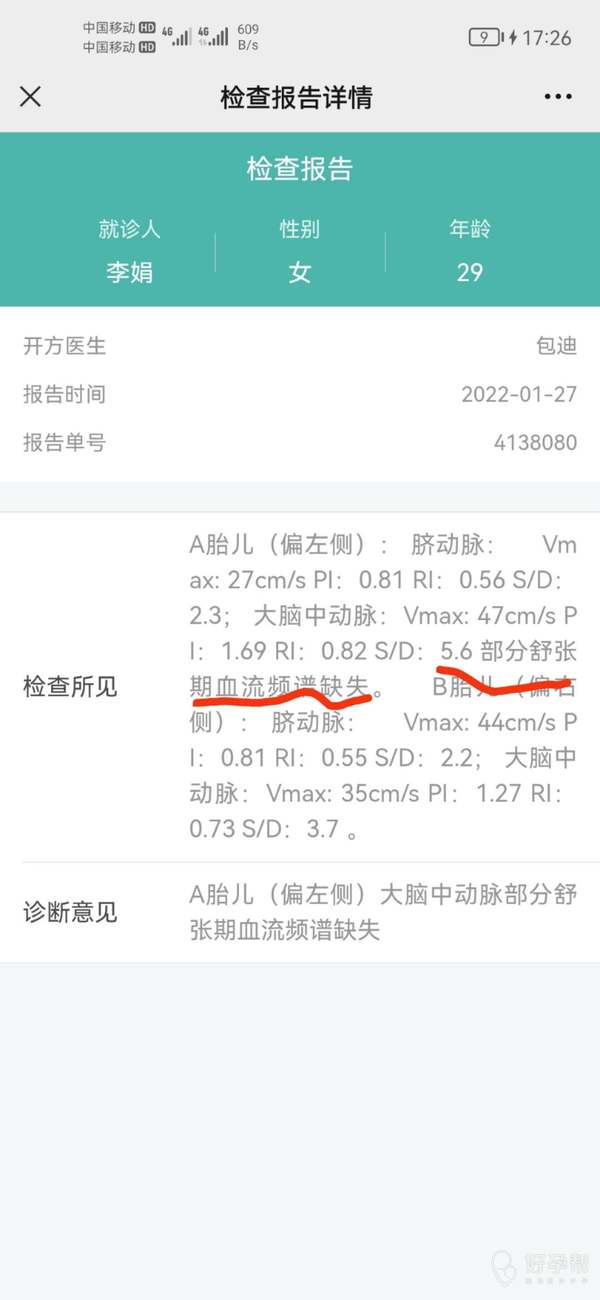你好,这个是胎儿1的大脑中动脉血流缺失,会引起缺氧,目前孕几周了?建议吸氧后再复查看看
