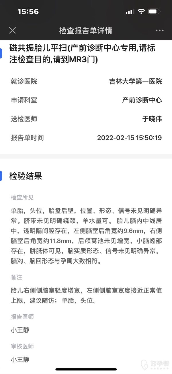 孕35周今天做的胎儿核磁共振左右侧脑室增宽这