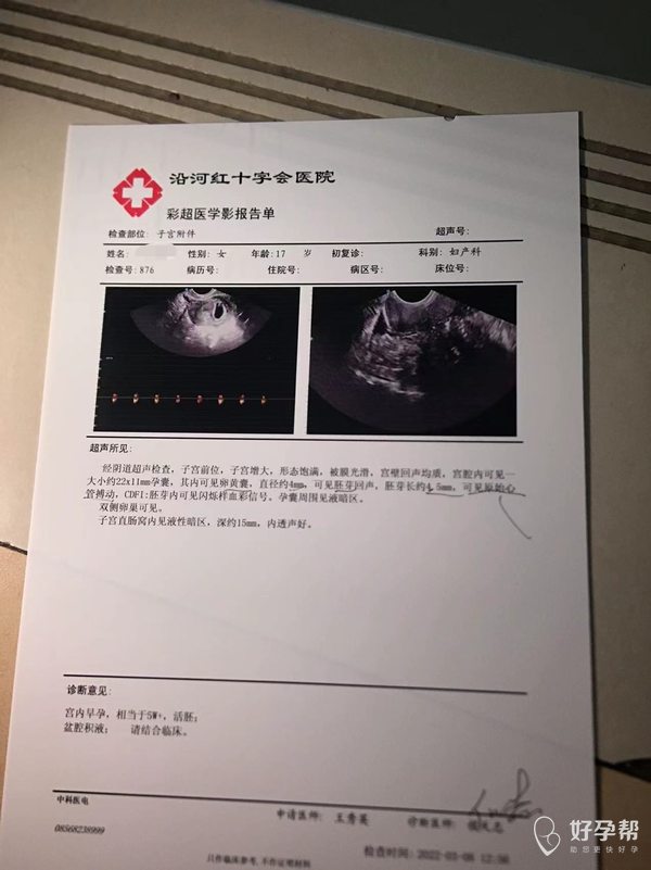 这已经有原始心管搏动,CRL0.45,差不多7周了。孕囊有22,末次月经什么时候的?阴道b超35-37天可以看到卵黄囊,5-7周crl的生长速度大约是1mm/d,孕龄天数=孕囊直径+30,这个应该有7w+-4天了。孕囊周围有安全,有阴道出血吗?