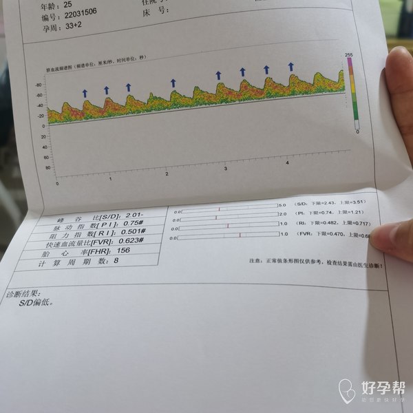 s/d比值偏高提示胎儿缺氧可能,偏低的意义不是很大,注意胎动,胎监没问题可以先观察下