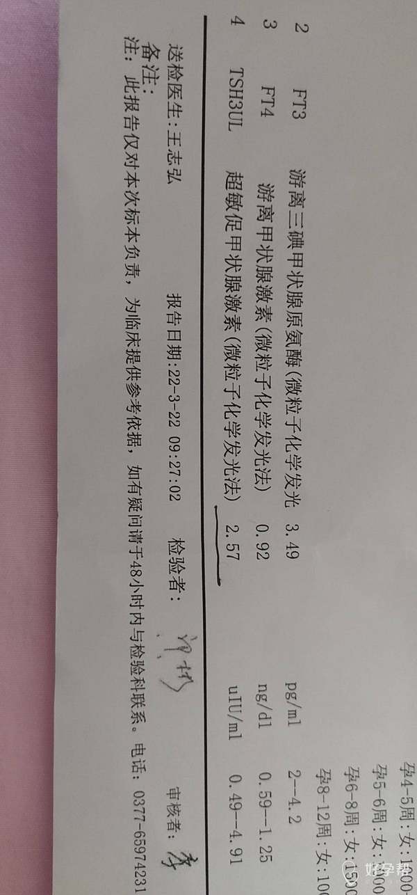 没怀孕我的甲状腺就高,没怀孕就开始吃药调理了,都是吃半粒,这是我怀孕后的甲功三项,第一次查是2.57,后面回去还是一天吃半粒 第二次查是隔了一个月,第二次查是1.54,现在降到2 5以下了 接下来是怎么吃药呢 ?