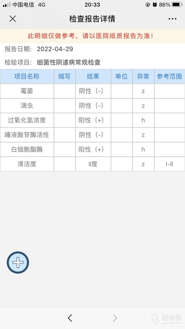 孕12周出现褐色分泌物。上周四大便后,有阴道的少量褐色分泌物,第二天去医院做了Nt,医生检查阴道,说是陈旧性出血,宫颈上有干掉的褐色分泌物。并取了分泌物检查。检查结果下图。开了乳酸菌胶囊阴道给药。那天也确实太累了,Nt做了四次才成功。折腾了一整天。后边的几天在家未出过门,除了一些简单的家务,就休息。似乎用力大便就会有褐色分泌物,平躺休息就会缓解。既往有两次孕中期自然流产,多囊卵巢合并胰岛素抵抗。自怀孕后一直口服地屈孕酮片,早晚各一次