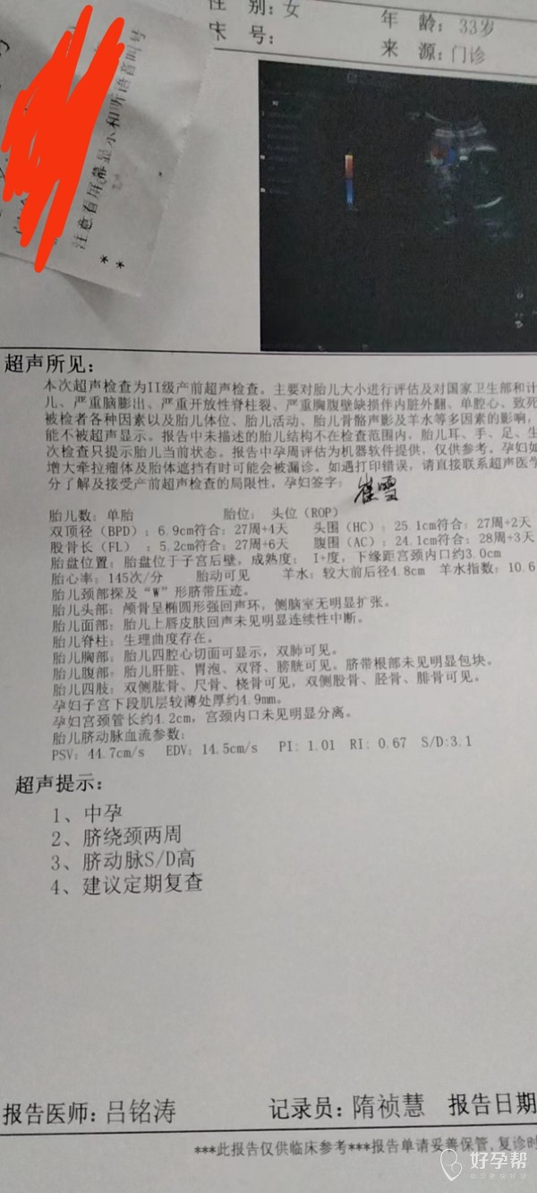 孕30周去做个B超看看胎儿心脏发育,顺便看看羊水胎盘胎位情况,及S/D比值,脐带情况,注意胎动。