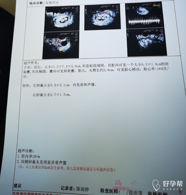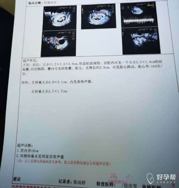 B超头臀径提示10+4周,孕周相符,孕囊也长了,继续观察,继续肝素治疗。