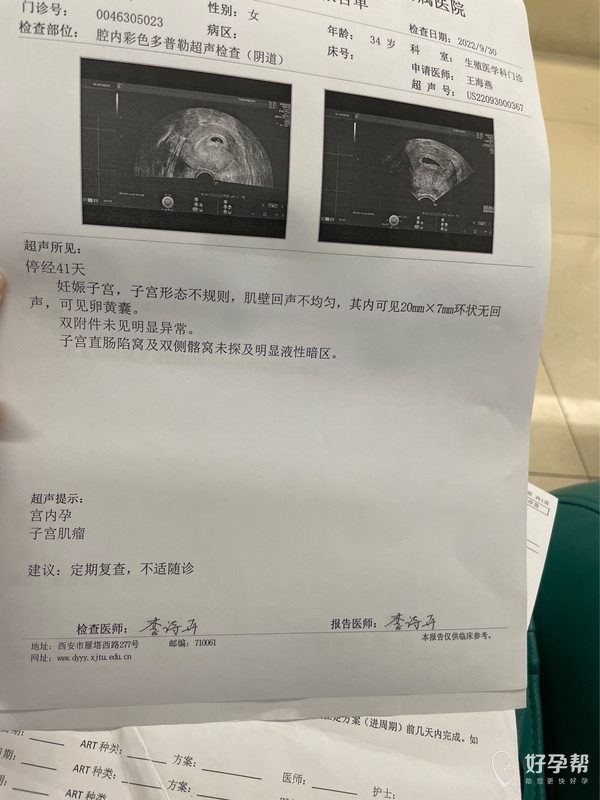 20*7是孕囊,长条是切面问题,肌瘤超声没有明确描述,说明很小