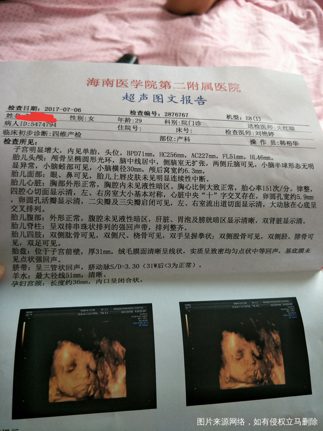 宝宝三个月的时候就约了四维彩超了,今天终于到了预约的日子了,一大早就起床向医院出发,排队第三个,排队等待期间莫名的紧张激动,一直揪着老公的手。9点10几分左右,终于叫到我的号了,进去B超室,一个医生叫我签一份什么四维彩超知情书之类的,内容我也没有看,医生边说我边签名,就是说不能100%全部看清之类的话。躺下后,医生就开始了各种照,哈哈,不知道是不是宝宝早上太懒了,一直趴着不给医生看完全,医生就叫我去爬楼梯,15分钟后再去照照,听了医生的话,就爬楼梯去了,爬楼梯,各种累,还汗流浃背的,爬了大约10分钟后,就有来走去,不一会医生就叫我了,继续躺下各种照,医生还开了小苹果的音乐,希望宝宝跟着音乐一起动,可我们家宝宝依然很淡定,还是不给医生看,哈哈,没办法,医生叫我继续去走!出了B超室,我都不想动了,做在休息区休息了一会,吃了点东西,来回走了几趟就等着医生再次叫我,时间过去了大约1个小时,第三次踏进B超室,还好宝宝心疼妈妈,这一次医生想看的都看到了。虽然折腾了一个上午,拿到报告看看宝宝脸的那一刻很高兴,妈妈爸爸第一次看看宝宝的小脸都很兴奋,看了半天才离开医院。