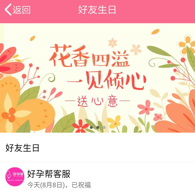 好孕帮:你好![鲜花][鲜花][鲜花]我是你们的一位用户,我诚挚的送上一句最古老但又是最新鲜出炉的祝福:生日快乐![礼物][礼物][礼物]希望好孕帮越办越好,真心祝好孕帮生日快乐!我跟你相识一年多了!难忘是你我的友情!可贵是永远不变的真情!高兴是能认识你好孕帮![鲜花][鲜花][鲜花]在这个特别的日子,我没有更好的祝福,也许你已不需要我的陪伴,又或许你已不在乎我的存在,但我永远记得今天这个日子:祝好孕帮生日快乐![礼物][礼物][礼物]虽然我只是你远方的朋友,然而我的祝福却一直伴在你身边!网络是虚幻的,感觉是真实的,天空中没了爱的翅膀,留下的是美好的回忆。在此好孕帮越办越好![鼓掌][鼓掌][鼓掌]