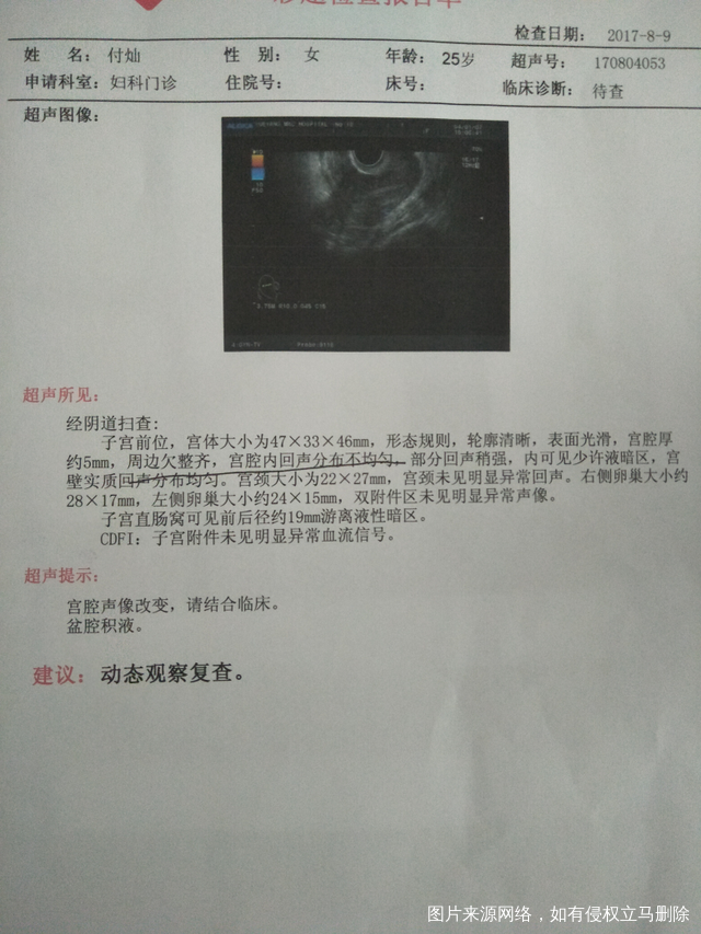 清宫没清干净,又做了美奥舒清宫,一个星期照B超结果异常,有懂的帮我看下