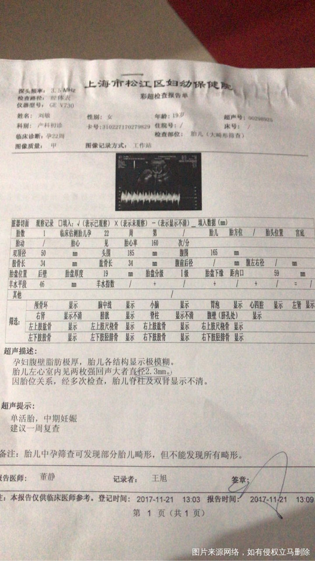 二家医院的结果、一个是大畸形筛查、一个是四维、在松江妇幼保健院做的大畸形筛查说小孩没翻身有的地方看不到、让我下个星期去复查、还说有可能心脏病、今天去上海百佳医院做了四维什么都没有什么都看的清清楚楚,我自己都看到小孩在肚子里的动态了2017-11-22 21:41:16