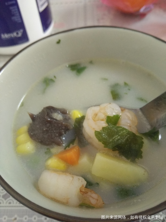鲫鱼汤底,加上玉米粒,豌豆粒,土豆粒,虾仁,胡萝卜,小虾米,海参[偷笑][偷笑]