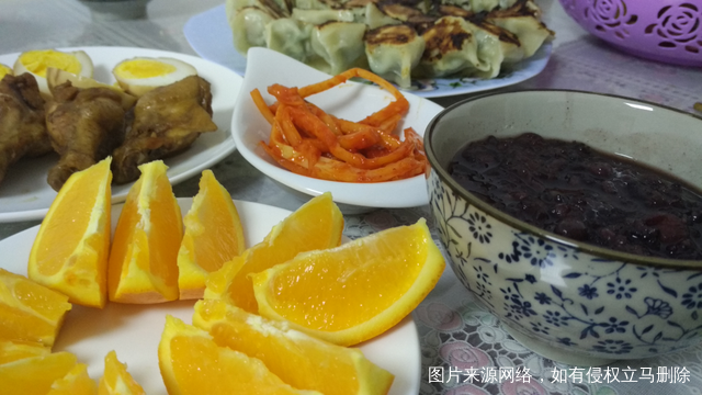 的早餐,八宝粥,酱鸡翅,卤蛋,咸菜,煎饺,橙子。最近老公天天上班早,辛苦了
