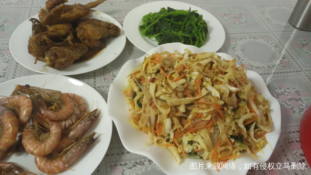 娃就哭着要吃奶,就这样吧,不炒了,卤鸡翅,菠菜 ,大拌菜,虾