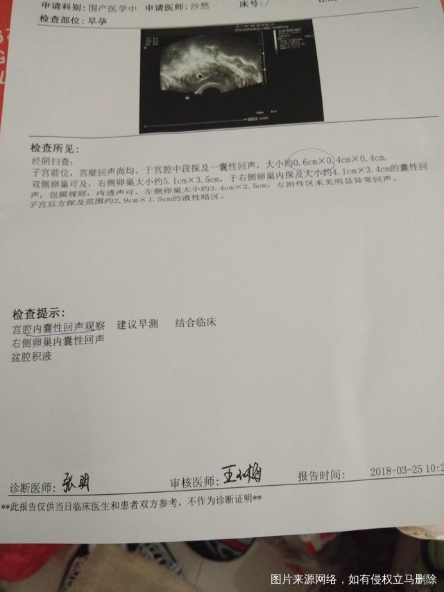以前有过两次胎停育流产史,12月28号来完例假后就没再来,3月中旬试条测出两条杠,昨天做的检查,请医生给看一下,有什么问题吗