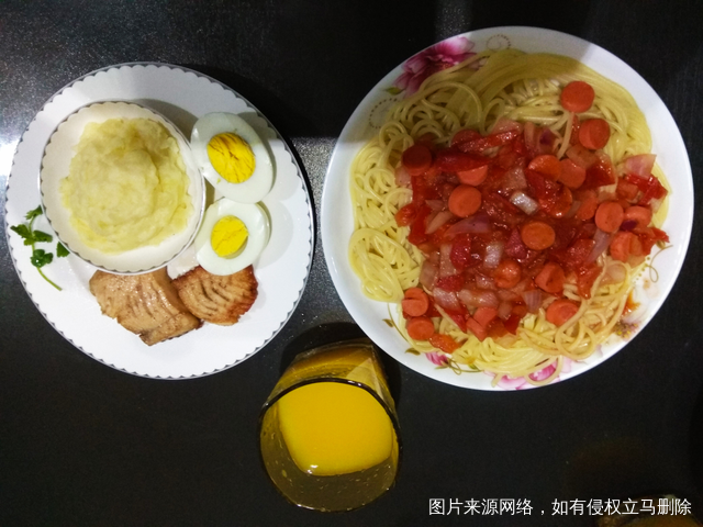 晚饭:意大利面,土豆泥,香煎三文鱼,水煮蛋,果汁