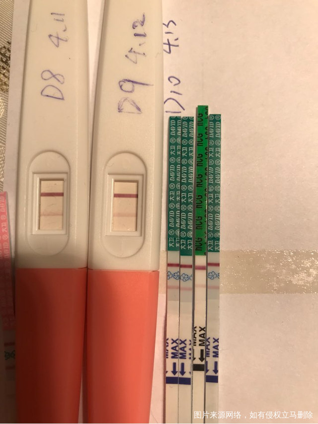 今天移植第10天,我怎么觉得试纸颜色没有渐深呢? 倒数三个都是今天测的。