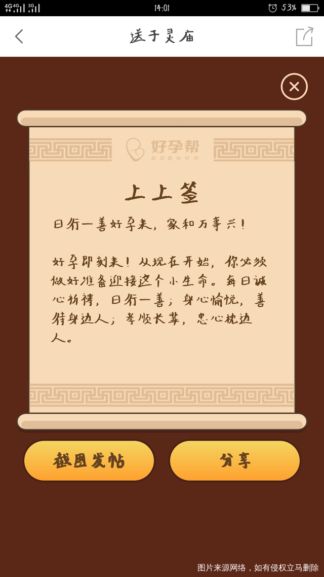 这几天都在抽签,要不就是上签,要不就是上上签!今天居然抽到这个签,重来没有抽到过!难道,这个月真的能好孕,天赐灵儿!娘娘,保佑我吧!加油加油↖(^ω^)↗