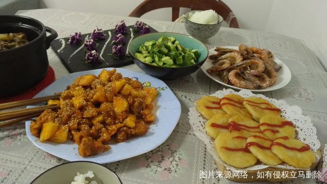 做了几个小朋友喜欢吃的菜,菠萝咕咾肉没放青红椒,紫薯沙拉,虾,土豆饼,拌黄瓜,鸡腿炖香菇
