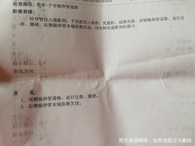 输卵管双侧通畅,走行迂曲、僵硬,右侧输卵管末端弥散欠佳。