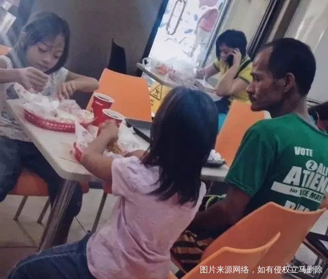 一个面容憔悴的父亲,正默默看着两个女儿吃炸鸡,但自己什么都没点。他跟女儿说自己不饿,其实是口袋里没有更多的钱。