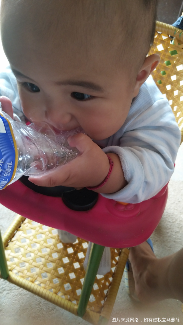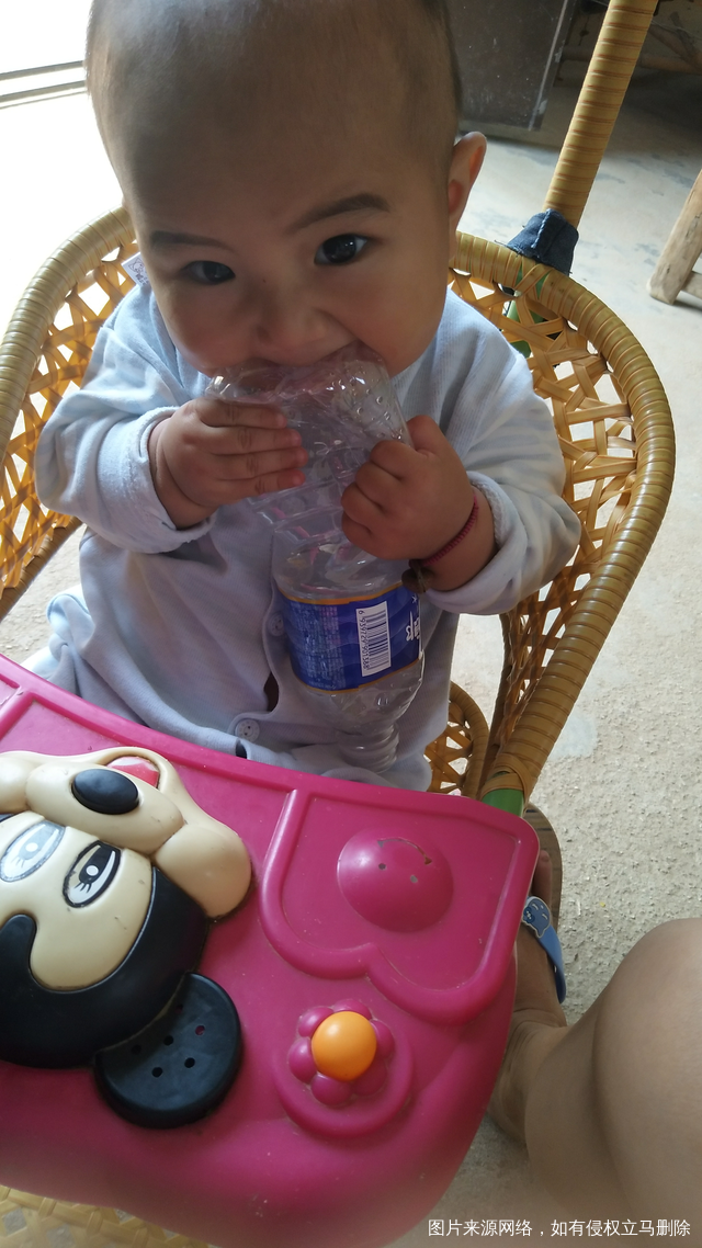 我家娃娃真暴力呀,把矿泉水瓶都咬扁了