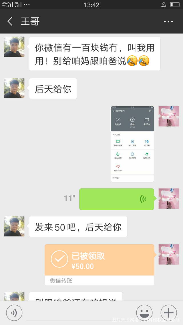 借我100元,我微信上就剩下70多了,发过去50.我之前设置的延迟入账,他不能马上花,老公微信里有,先发过去了100,前两天有300多,在网上买买买,剩下的不多了。(我结婚时,哥哥借了我1000到现在快两年了,都没有还我,我结婚时,哥哥也没有送礼。(哥哥生意不好,只能勉强顾着自己,希望以后越来越好。))