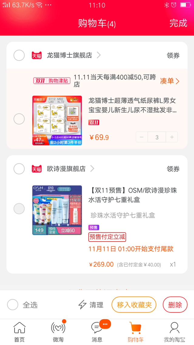 目前购物车里就这些东西了,虽然不多,但是买下来也要400了,刚好可以参加400-50的活动,还是可以的。而且这几天还在逛淘宝,遇到比平时便宜又划算的东西我应该也会下单吧!目前已经看上了一款面膜,只是自己家里买的还没用完,正纠结要不要买呢!哎,双十一就是为女人准备的节日,对于我这个喜欢囤货的人来说,每年都要剁手了,只是今年可能买的比较多,现在还在看孩子的衣服,看好了又要下单了。都是钱💰💰啊![大笑][大笑]