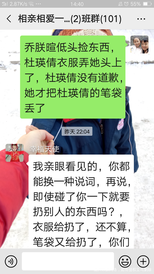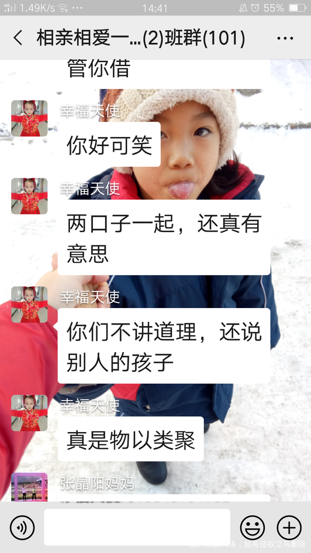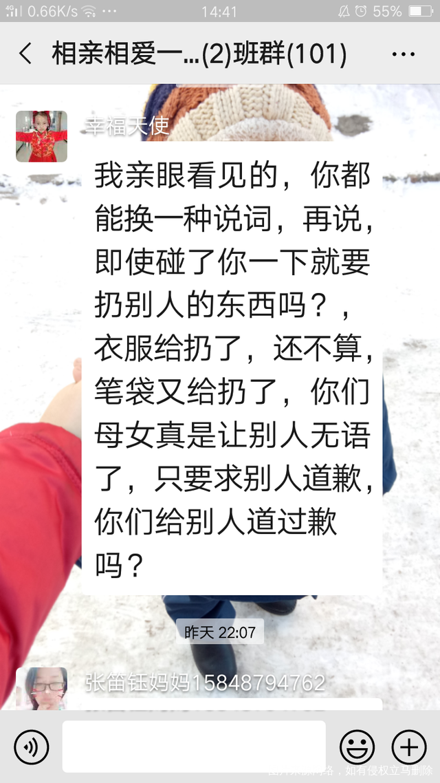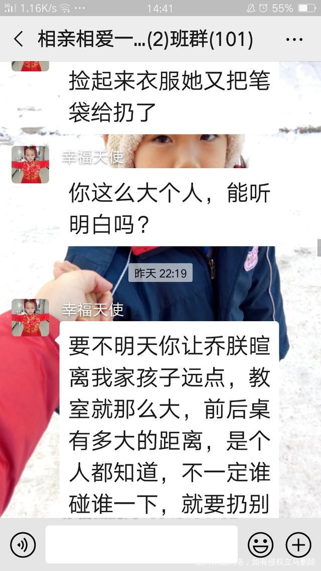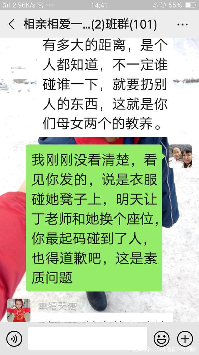 金金宝贝回复家有儿女:是她家孩子把衣服碰我家闺女椅子上,我家闺女就把她衣服丟地下了。让我给她道歉,真是不要脸,我家闺女成天和别的小盆友打打闹闹,头发被弄的像鸟窝,回来我也没说啥,简直不要脸
