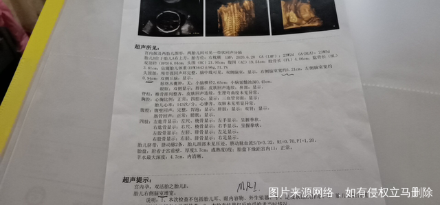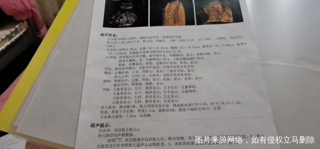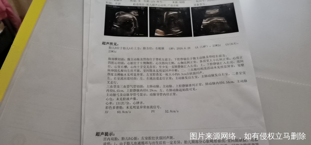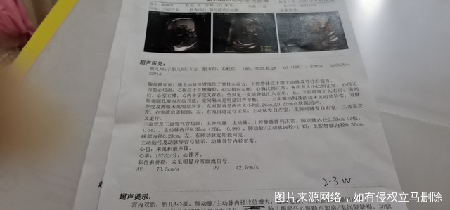 孕周23+2,无创低风险通过。双胎。四维彩超显示胎儿A,肠管回声稍增强,超声心动图显示,肺动脉/主动脉/内径比值增大,建议复查:左室腔灶状强回声斑。