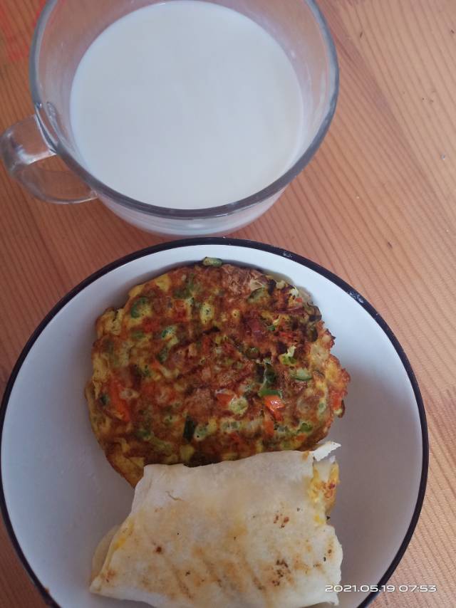 #第1天# 早饭,黑豆豆浆鸡蛋羹,南瓜青菜玉米面蔬菜饼