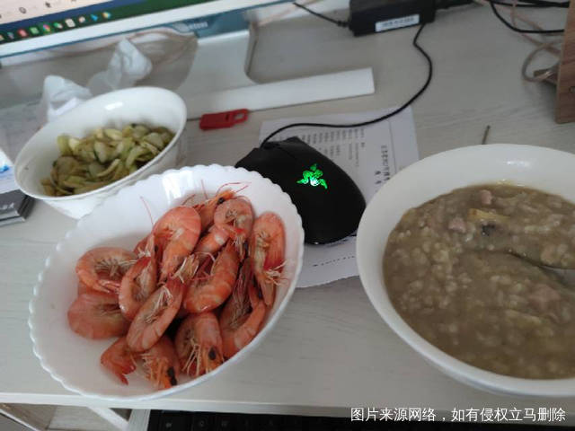 打卡今天的午餐,皮蛋瘦肉粥,🦐 ,还有拌黄